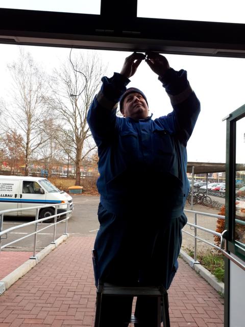Dirk K. beim Umrüsten der Tür. Derzeitig werden die Seitentüren in der Aula elektrisch umgerüstet. Alle Lehrer bekommen dann einen elektronischen Schlüssel mit dem sie die Türen öffnen können. elektronischer Türöffner Die Umrüstung wird noch ungefähr 1,5 Wochen dauern. Diana und Michelle