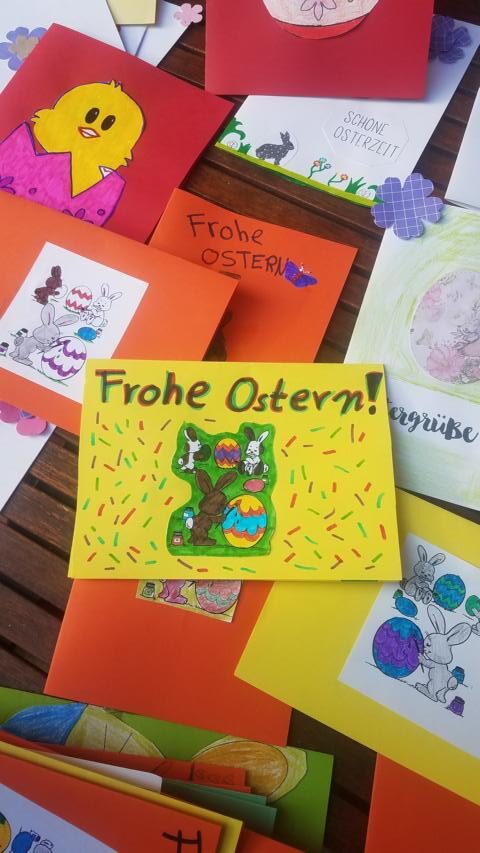 Viele Schülerinnen und Schüler der Osteschule malten, bastelten und schrieben in den letzten Tagen zahlreiche Ostergrüße. Diese werden an das in unmittelbarer Nachbarschaft gelegene Seniorenheim gebracht. Auf den bunten Karten sind viele gute Wünsche für ein schönes Osterfest zu lesen. Dem ist nichts hinzuzufügen. |